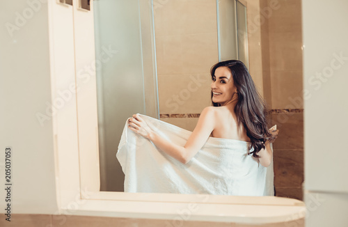 Woman In The Shower Beautiful Smiling Girl Getting Ready To Take