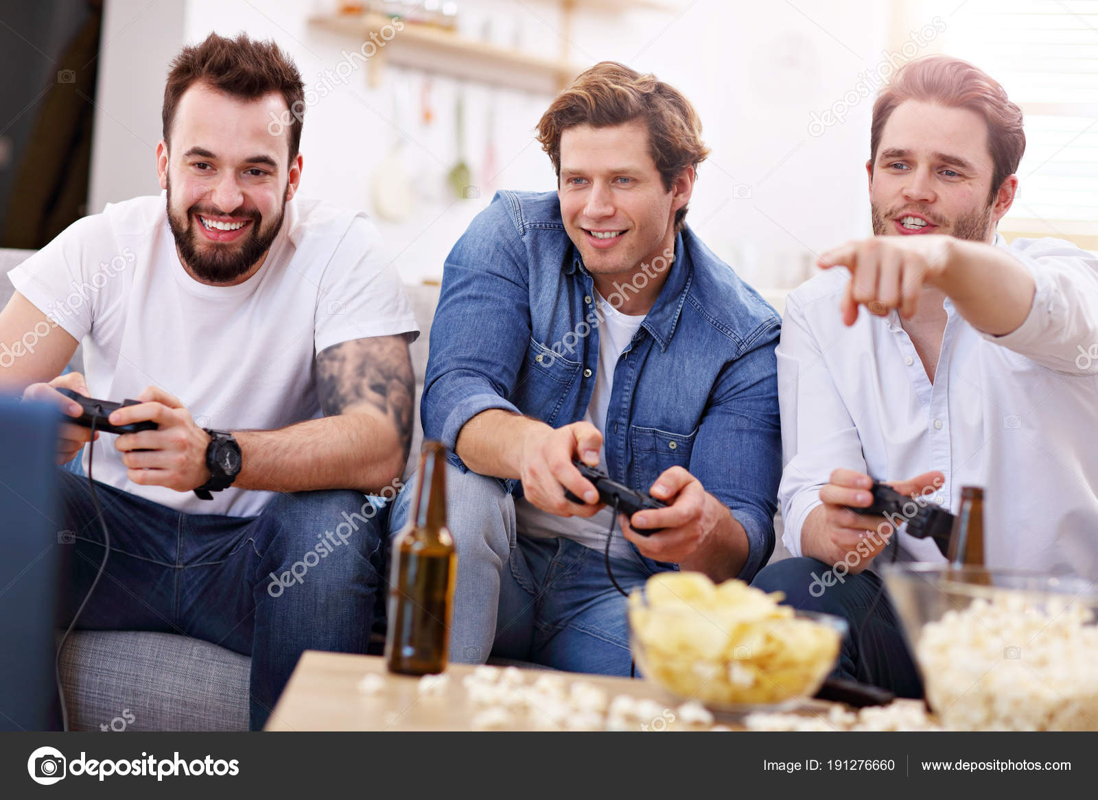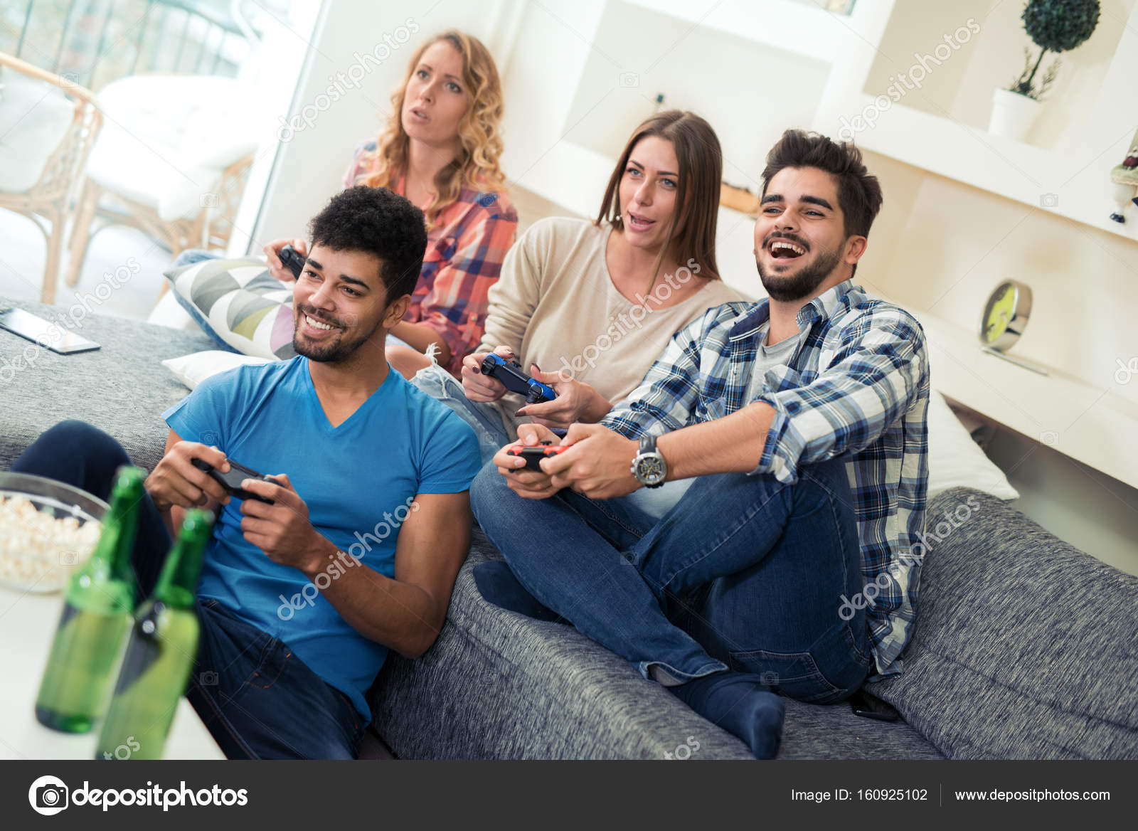 Friends Having Fun On The Couch With Video Games Stock Photo